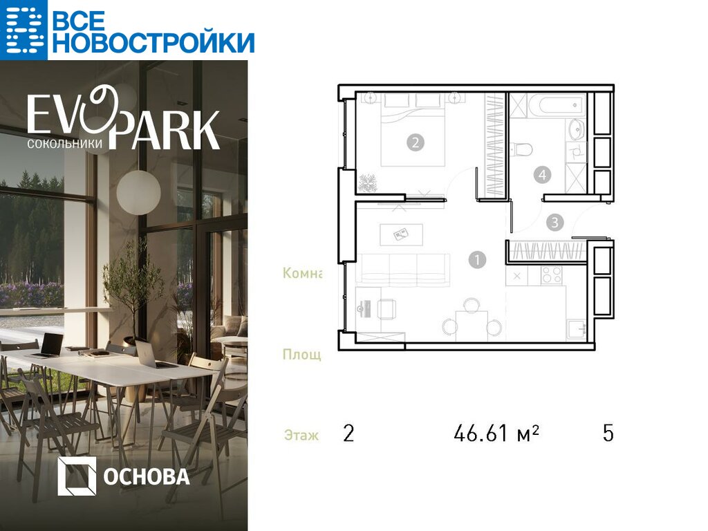 Продаются 2-к апартаменты площадью 46.61 кв.м. на 5-м этаже 20 этажного дома в EVOPARK Сокольники от ГК ОСНОВА.