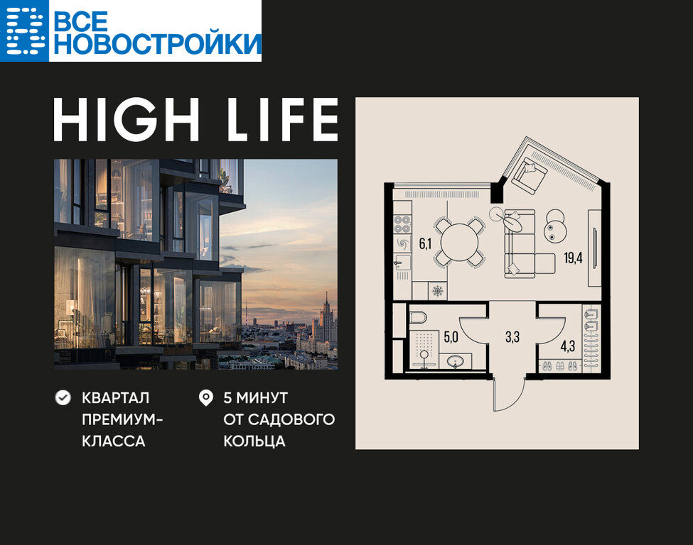 HIGH LIFE - премиальный проект компании PIONEER, расположенный в 5 минутах от Садового кольца, вблизи исторического Замоскворечья. Авторская архитектура от бюро ADM. Панорамные окна и изящные эркеры открывают виды на Кремль, МГУ, Москва-Сити, Дом Музыки и набережные реки. 70% видовых квартир. Инфраструктура и сервис отеля 5*: • Дизайнерские лобби от Jaime Beriestain Studio • Частный кинозал • Библиотека с камином • Двухуровневый двор-парк 2 га с хвойным лесом и террасами • Залы для йоги и занятий спортом • Массажный кабинет, SPA и бьюти-зоны • Консьерж-сервис Технологии и инженерия: • Центральная система кондиционирования • Дополнительная вентиляция помещений • Буферная мусорокамера • Обеззараживание воздуха • Мониторинг качества воды с дополнительной доочисткой • Дополнительная шумоизоляция • Автоматизированная система передачи данных в УК Системы безопасности: • Датчики движения • Круглосуточное наблюдение • Система доступа с распознаванием лиц • Приложение для наблюдения за квартирой • Система пожарного обнаружения • Датчики дыма и протечек За 22 года на рынке недвижимости компания PIONEER реализовала более 30 проектов. Сегодня PIONEER - девелопер премиальной недвижимости с 4 проектами класса премиум и deluxe. Звоните, и мы с удовольствием расскажем все подробности о нашем замечательном проекте и условиях покупки. Продажа от застройщика.