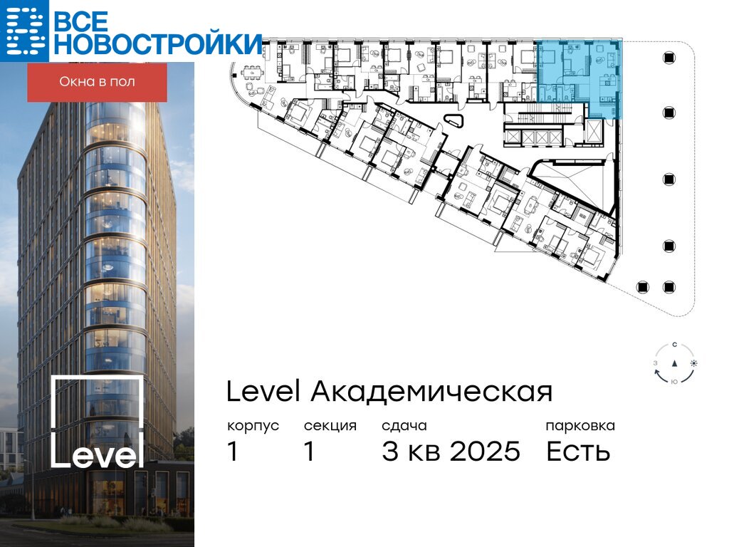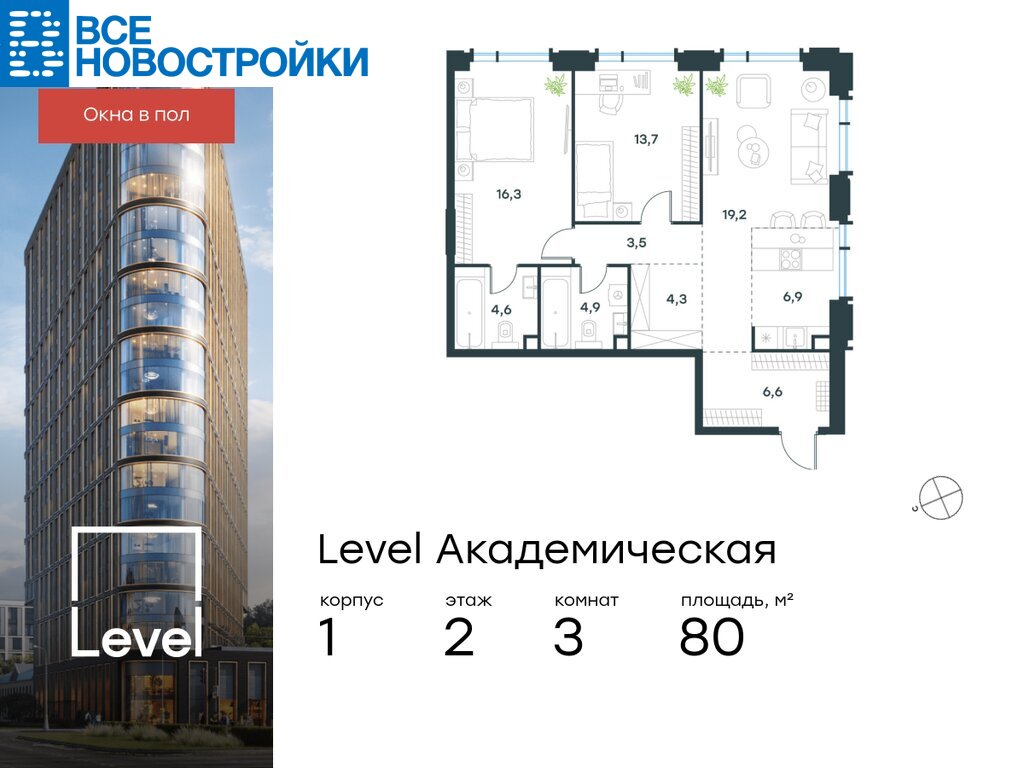 В Академическом районе продаётся 3-комнатная квартира площадью 80.00 кв.м без отделки. Квартира расположена на 2-м этаже 19-этажного корпуса «1» в жилом комплексе бизнес-класса Level Академическая (компания Level Group).