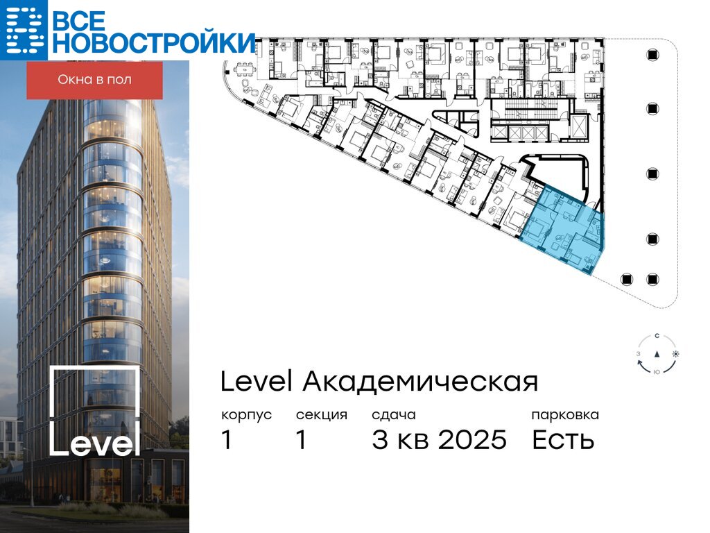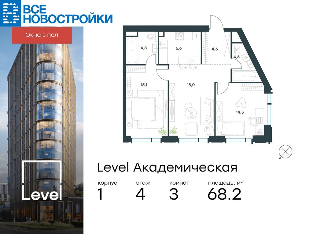 В Академическом районе продаётся 3-комнатная квартира площадью 68.20 кв.м без отделки. Квартира расположена на 4-м этаже 19-этажного корпуса «1» в жилом комплексе бизнес-класса Level Академическая (компания Level Group).