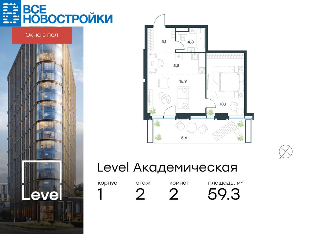В Академическом районе продаётся 2-комнатная квартира площадью 59.30 кв.м без отделки. Квартира расположена на 2-м этаже 19-этажного корпуса «1» в жилом комплексе бизнес-класса Level Академическая (компания Level Group).