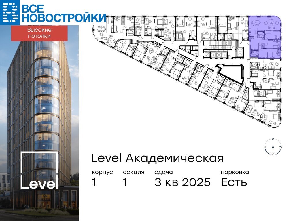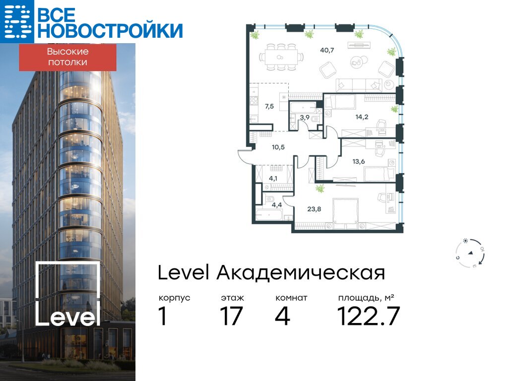 В Академическом районе продаётся 4-комнатная квартира площадью 122.70 кв.м без отделки. Квартира расположена на 17-м этаже 19-этажного корпуса «1» в жилом комплексе бизнес-класса Level Академическая (компания Level Group).