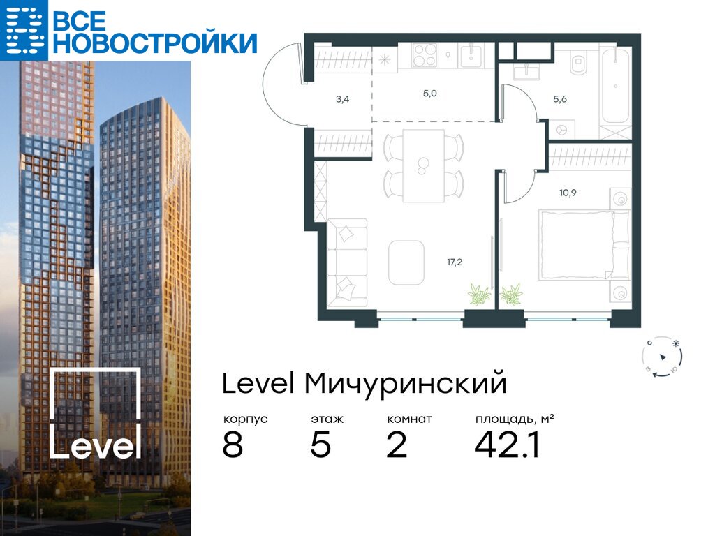 В жилом квартале, расположенном на границе с природным заказником «Долина реки Очаковки», продаётся 2-комнатная квартира площадью 42.10 кв.м без отделки. Квартира расположена на 5 этаже 48-этажного корпуса №8 в жилом комплексе бизнес-класса Level Мичуринский (компания Level Group/Левел групп).