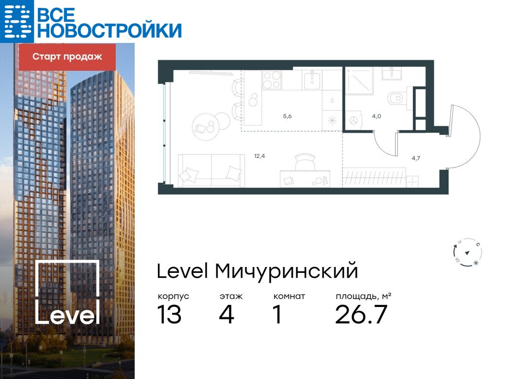 В жилом квартале, расположенном на границе с природным заказником «Долина реки Очаковки», продаётся студия площадью 26.70 кв.м без отделки. Квартира расположена на 4 этаже 31-этажного корпуса №13 в жилом комплексе бизнес-класса Level Мичуринский (компания Level Group/Левел групп).