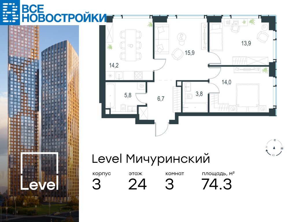В жилом квартале, расположенном на границе с природным заказником «Долина реки Очаковки», продаётся 3-комнатная квартира площадью 74.30 кв.м с отделкой white box. Квартира расположена на 24 этаже 30-этажного корпуса №3 в жилом комплексе бизнес-класса Level Мичуринский (компания Level Group/Левел групп).
