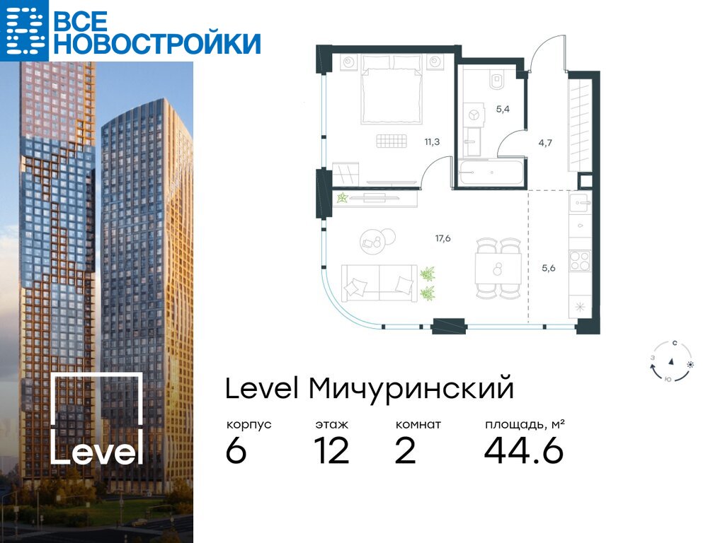 В жилом квартале, расположенном на границе с природным заказником «Долина реки Очаковки», продаётся 2-комнатная квартира площадью 44.60 кв.м без отделки. Квартира расположена на 12 этаже 20-этажного корпуса №6 в жилом комплексе бизнес-класса Level Мичуринский (компания Level Group/Левел групп).