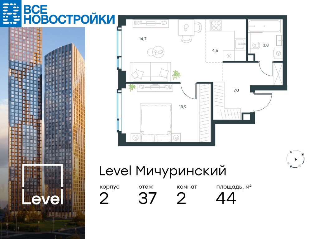 В жилом квартале, расположенном на границе с природным заказником «Долина реки Очаковки», продаётся 2-комнатная квартира площадью 44.00 кв.м без отделки. Квартира расположена на 37 этаже 42-этажного корпуса №2 в жилом комплексе бизнес-класса Level Мичуринский (компания Level Group/Левел групп).