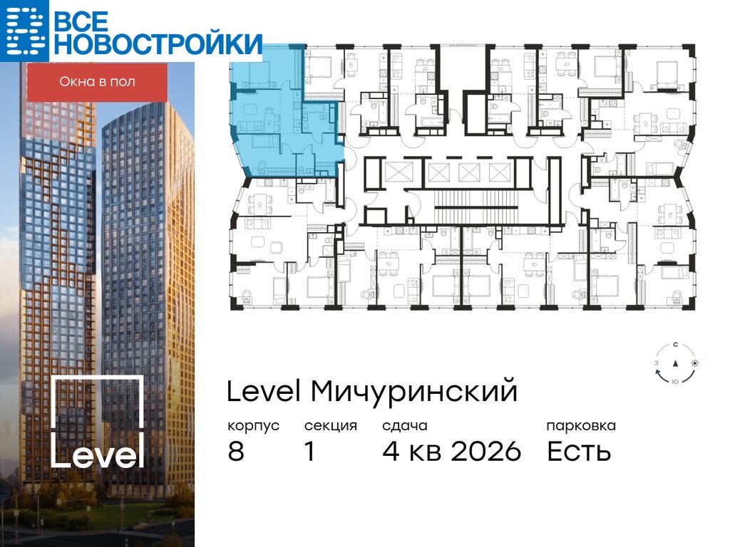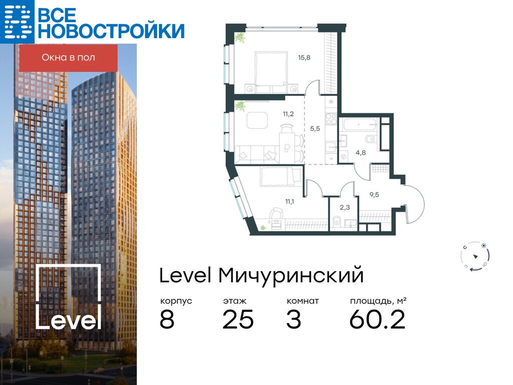 В жилом квартале, расположенном на границе с природным заказником «Долина реки Очаковки», продаётся 3-комнатная квартира площадью 60.20 кв.м без отделки. Квартира расположена на 25 этаже 48-этажного корпуса №8 в жилом комплексе бизнес-класса Level Мичуринский (компания Level Group/Левел групп).