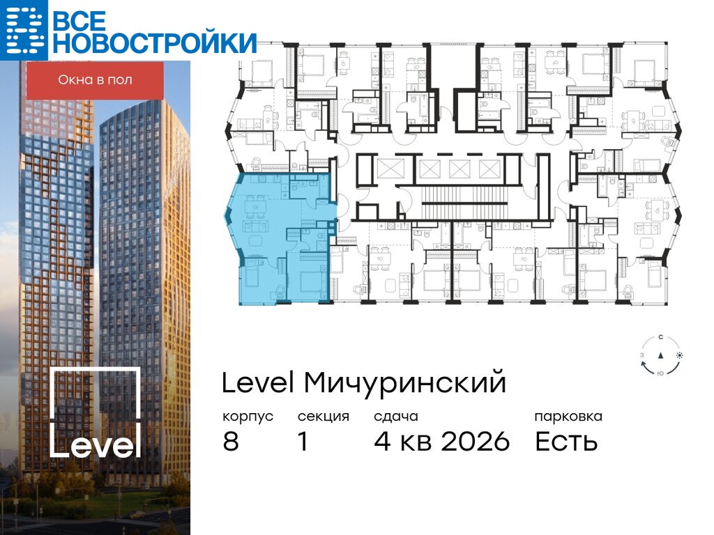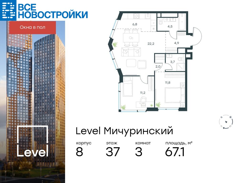 В жилом квартале, расположенном на границе с природным заказником «Долина реки Очаковки», продаётся 3-комнатная квартира площадью 67.10 кв.м без отделки. Квартира расположена на 37 этаже 48-этажного корпуса №8 в жилом комплексе бизнес-класса Level Мичуринский (компания Level Group/Левел групп).