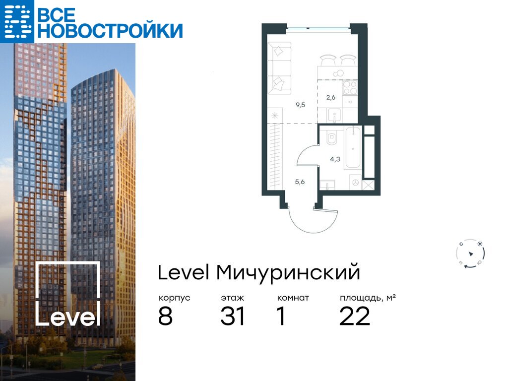 В жилом квартале, расположенном на границе с природным заказником «Долина реки Очаковки», продаётся студия площадью 22.00 кв.м без отделки. Квартира расположена на 31 этаже 48-этажного корпуса №8 в жилом комплексе бизнес-класса Level Мичуринский (компания Level Group/Левел групп).