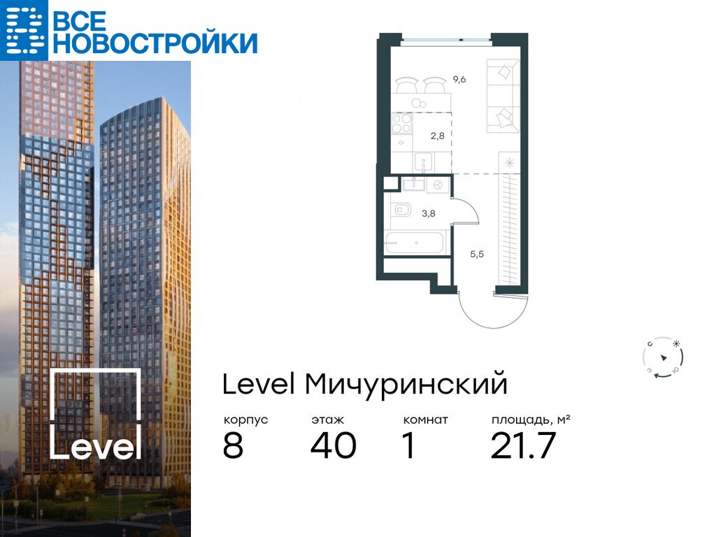 В жилом квартале, расположенном на границе с природным заказником «Долина реки Очаковки», продаётся студия площадью 21.70 кв.м без отделки. Квартира расположена на 40 этаже 48-этажного корпуса №8 в жилом комплексе бизнес-класса Level Мичуринский (компания Level Group/Левел групп).