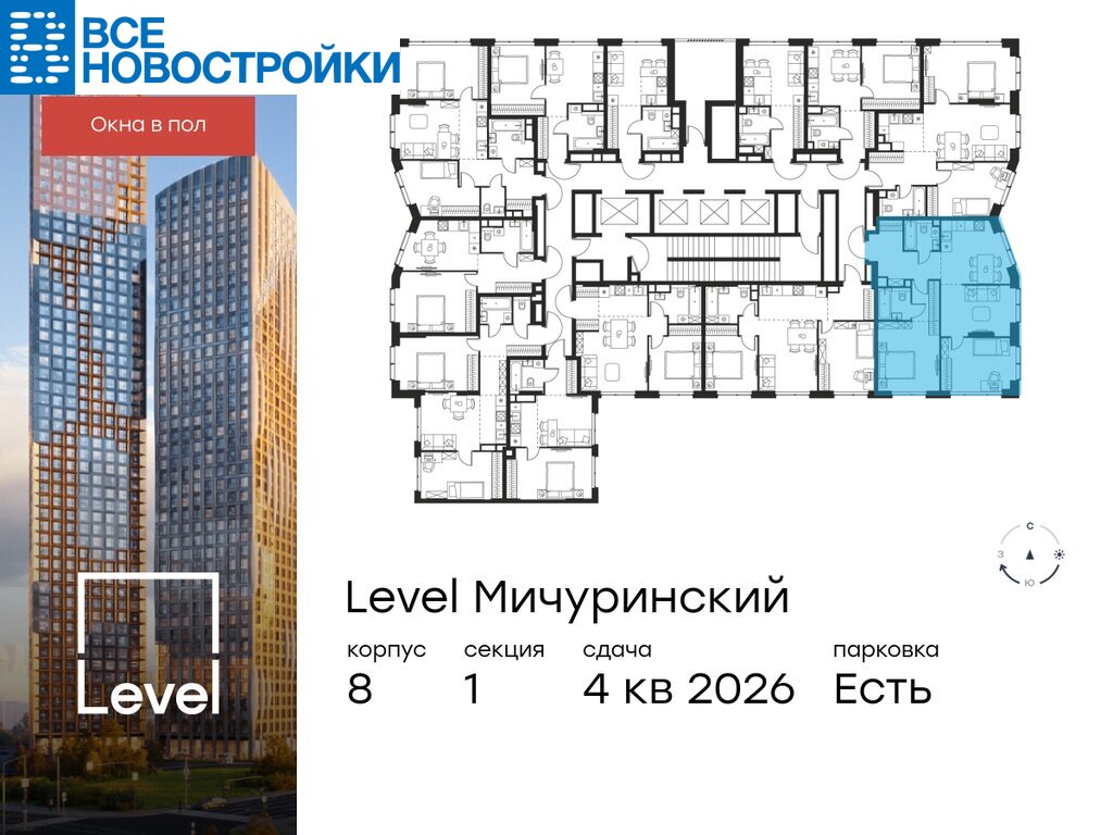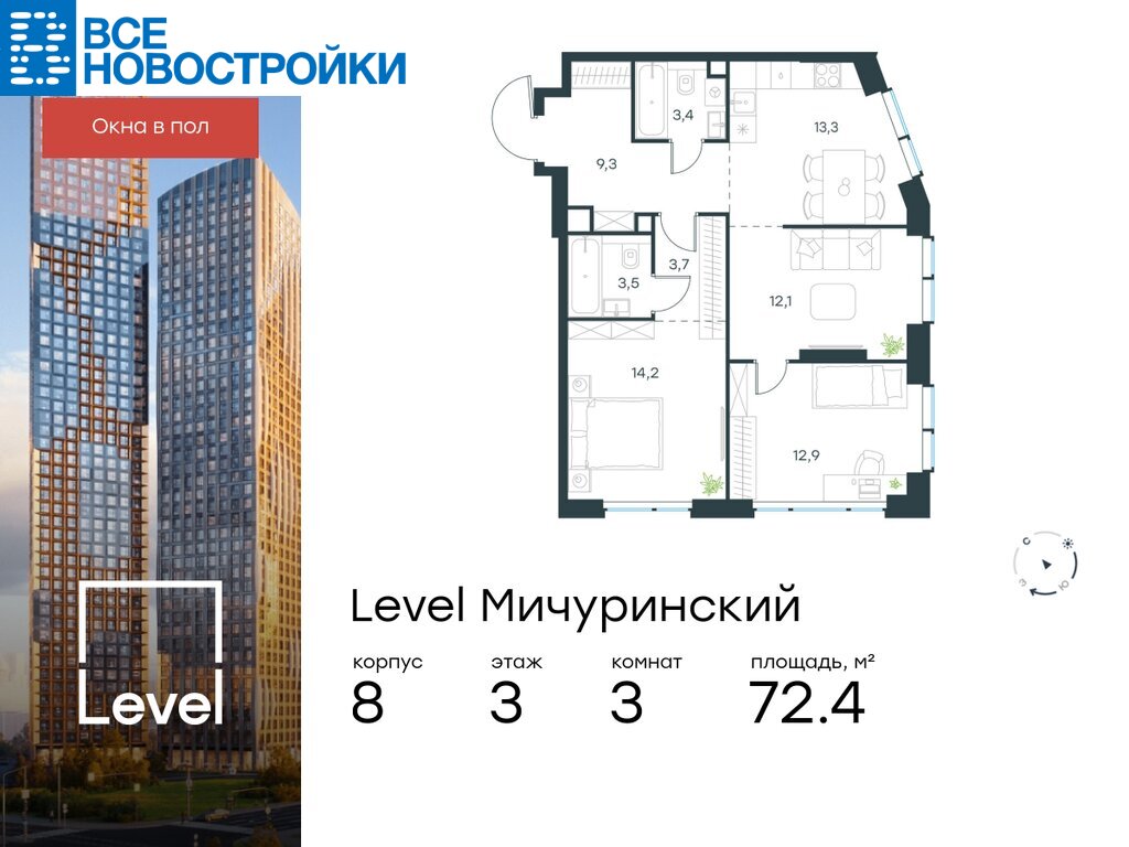 В жилом квартале, расположенном на границе с природным заказником «Долина реки Очаковки», продаётся 3-комнатная квартира площадью 72.40 кв.м без отделки. Квартира расположена на 3 этаже 48-этажного корпуса №8 в жилом комплексе бизнес-класса Level Мичуринский (компания Level Group/Левел групп).