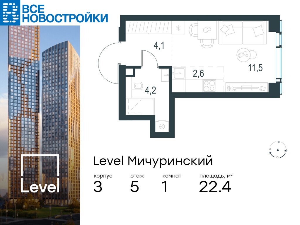 В жилом квартале, расположенном на границе с природным заказником «Долина реки Очаковки», продаётся студия площадью 22.40 кв.м с отделкой white box. Квартира расположена на 5 этаже 30-этажного корпуса №3 в жилом комплексе бизнес-класса Level Мичуринский (компания Level Group/Левел групп).