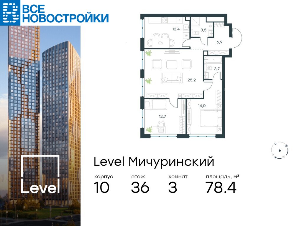 В жилом квартале, расположенном на границе с природным заказником «Долина реки Очаковки», продаётся 3-комнатная квартира площадью 78.40 кв.м с отделкой white box. Квартира расположена на 36 этаже 42-этажного корпуса №10 в жилом комплексе бизнес-класса Level Мичуринский (компания Level Group/Левел групп).
