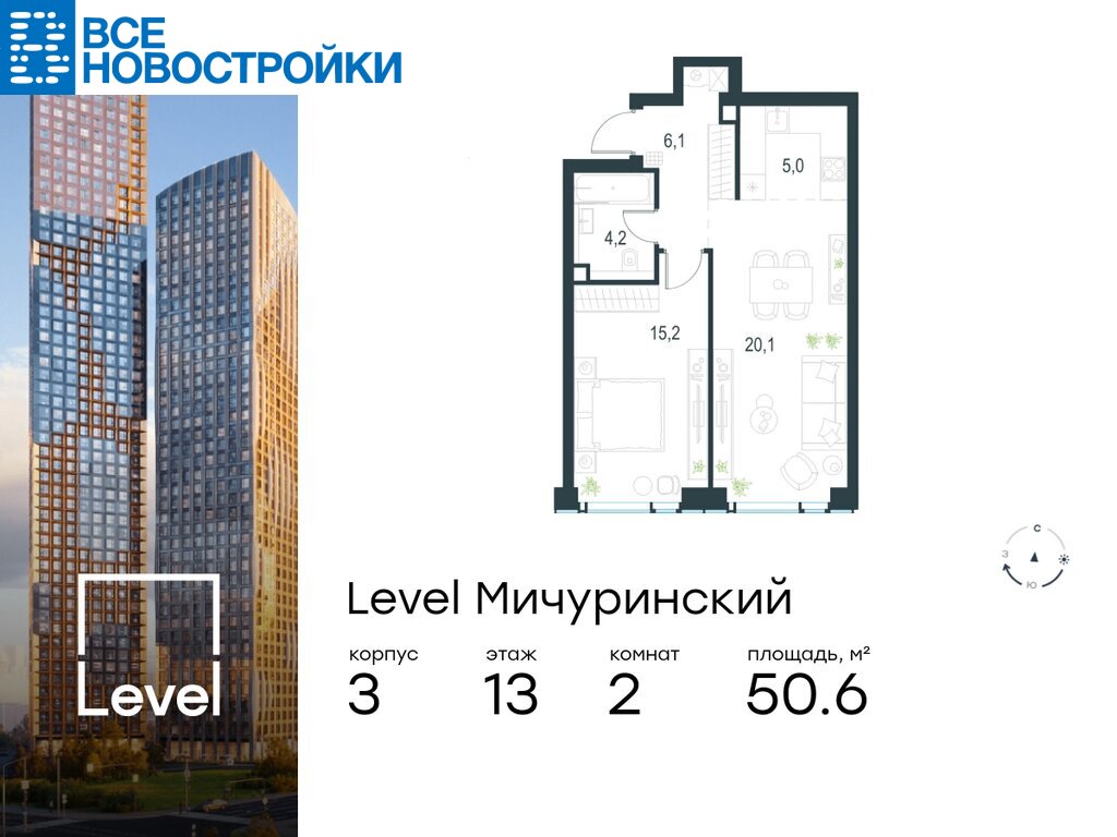 В жилом квартале, расположенном на границе с природным заказником «Долина реки Очаковки», продаётся 2-комнатная квартира площадью 50.60 кв.м с отделкой white box. Квартира расположена на 13 этаже 30-этажного корпуса №3 в жилом комплексе бизнес-класса Level Мичуринский (компания Level Group/Левел групп).