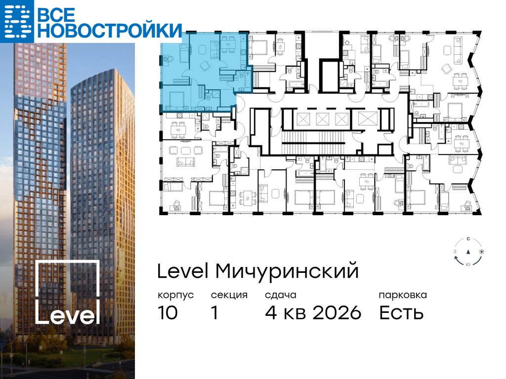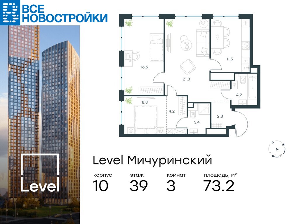 В жилом квартале, расположенном на границе с природным заказником «Долина реки Очаковки», продаётся 3-комнатная квартира площадью 73.20 кв.м с отделкой white box. Квартира расположена на 39 этаже 42-этажного корпуса №10 в жилом комплексе бизнес-класса Level Мичуринский (компания Level Group/Левел групп).