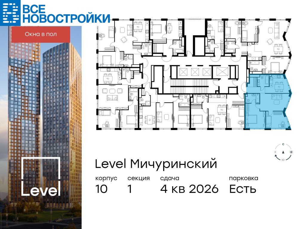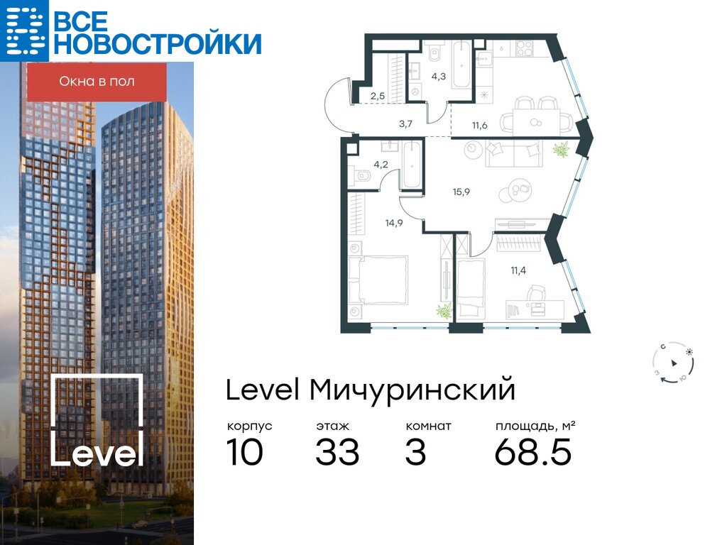 В жилом квартале, расположенном на границе с природным заказником «Долина реки Очаковки», продаётся 3-комнатная квартира площадью 68.50 кв.м с отделкой white box. Квартира расположена на 33 этаже 42-этажного корпуса №10 в жилом комплексе бизнес-класса Level Мичуринский (компания Level Group/Левел групп).