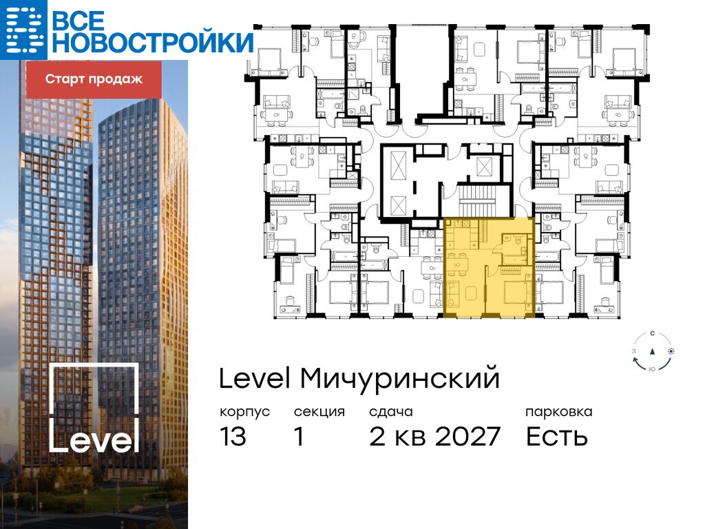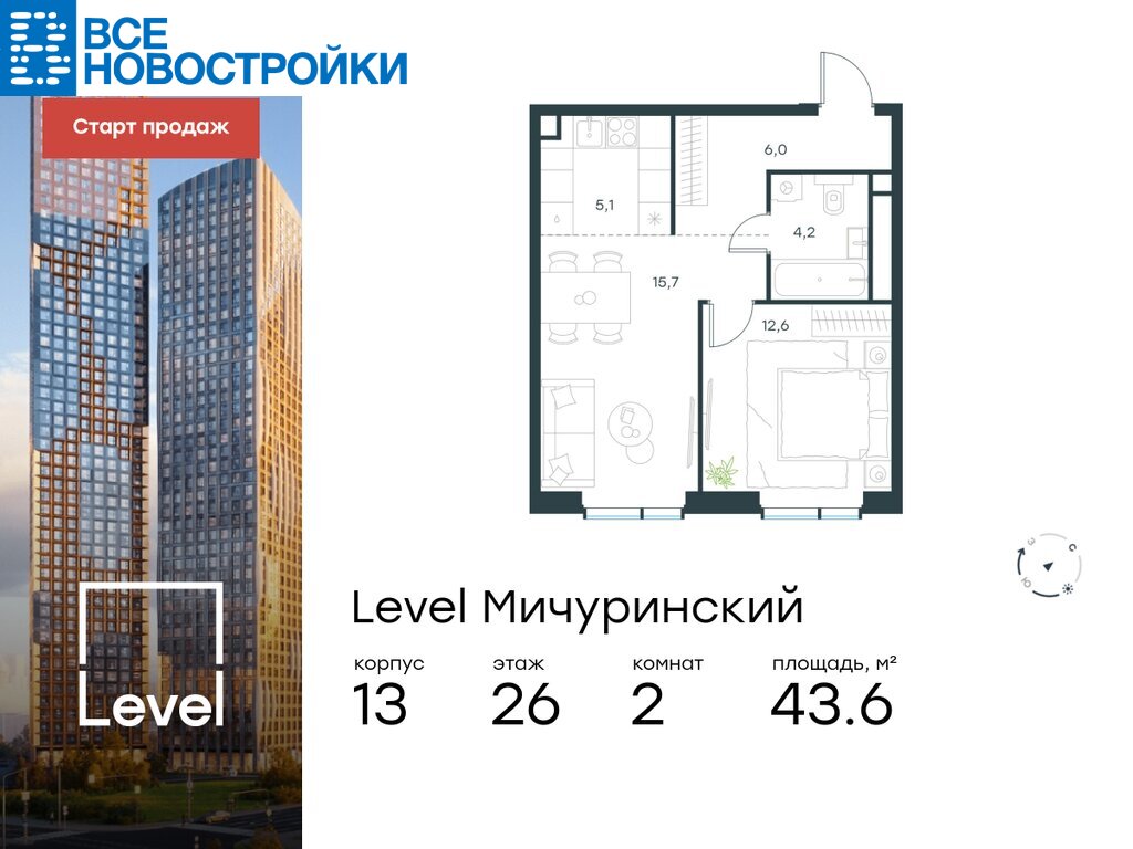 В жилом квартале, расположенном на границе с природным заказником «Долина реки Очаковки», продаётся 2-комнатная квартира площадью 43.60 кв.м без отделки. Квартира расположена на 26 этаже 31-этажного корпуса №13 в жилом комплексе бизнес-класса Level Мичуринский (компания Level Group/Левел групп).