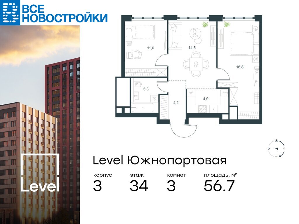 В перспективном районе на юго-востоке Москвы продается 3-комнатная квартира площадью 56.70 кв.м без отделки. Квартира расположена на 34 этаже 68-этажного корпуса №3 в жилом комплексе комфорт-класса Level Южнопортовая (компания Level Group/Левел групп).