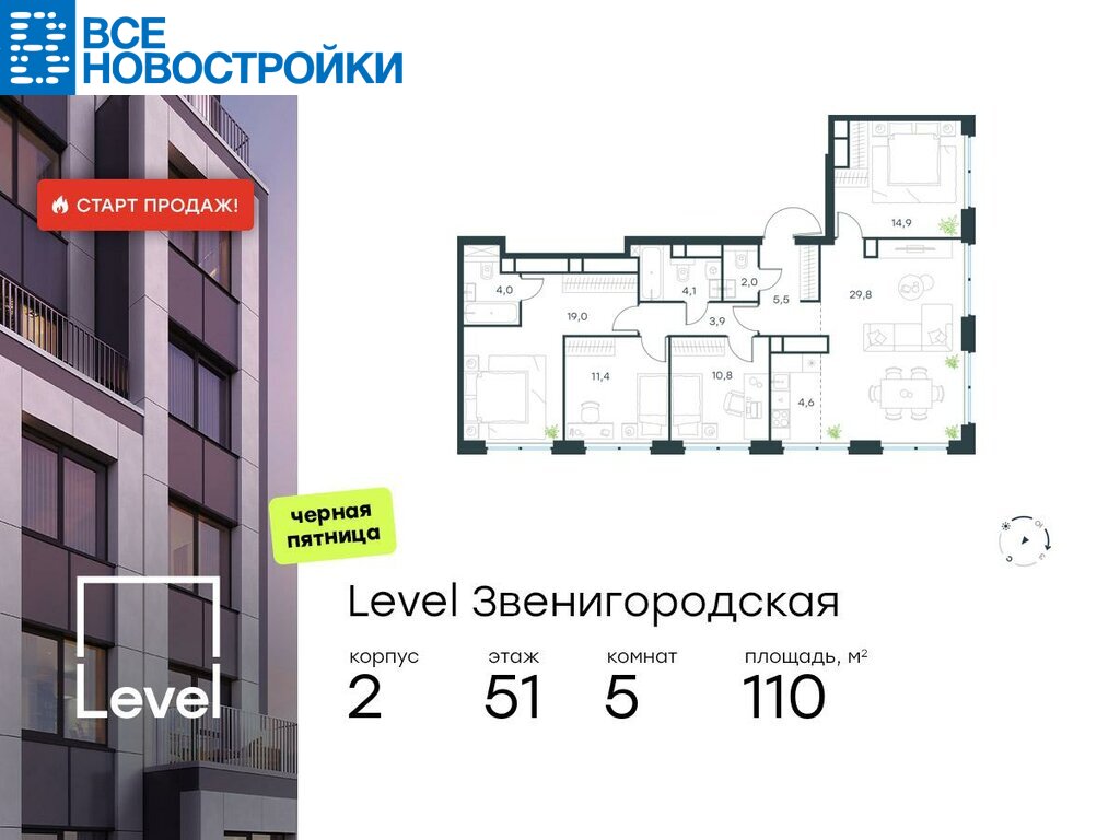 В престижном районе Хорошёво-Мнёвники, на северо-западе столицы продаётся 5-комнатная квартира площадью 110.0 кв.м Квартира расположена на 51 этаже 64-этажного корпуса №2 в жилом комплексе Level Звенигородская (компания Level Group/Левел групп).