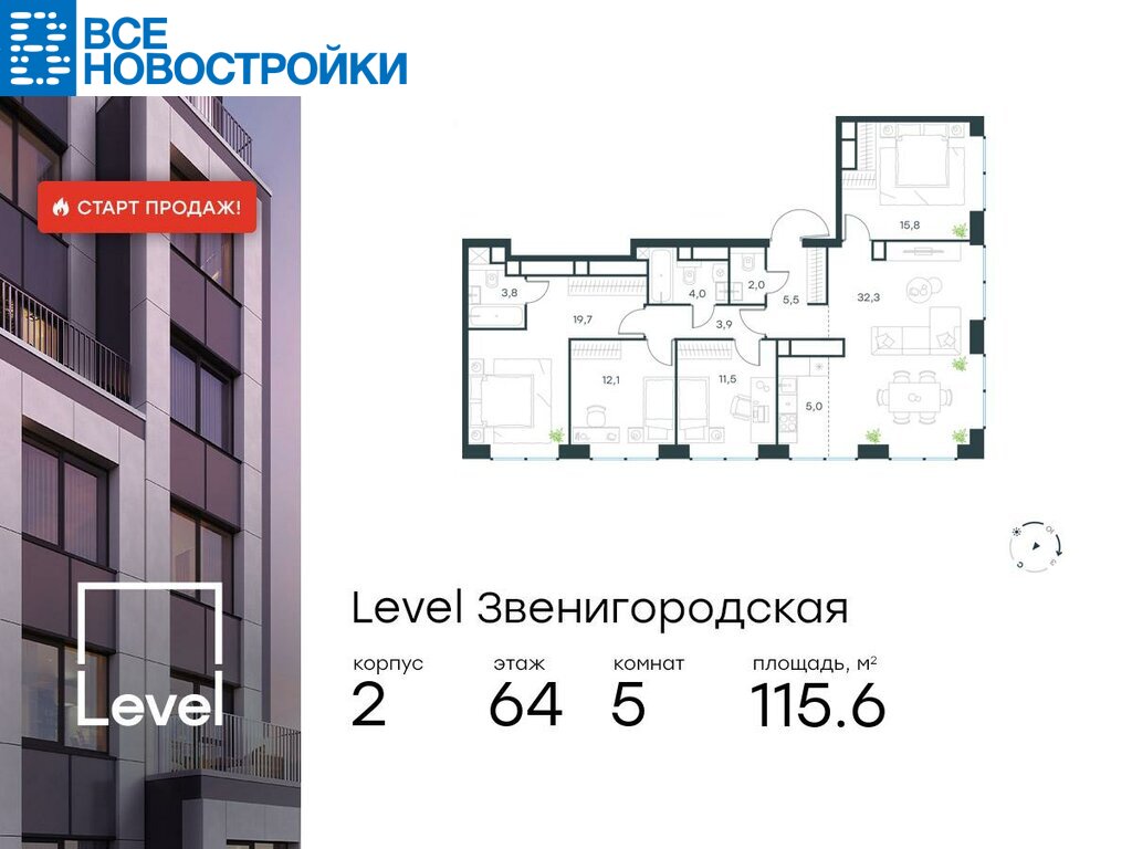 В престижном районе Хорошёво-Мнёвники, на северо-западе столицы продаётся 5-комнатная квартира площадью 115.6 кв.м Квартира расположена на 64 этаже 64-этажного корпуса №2 в жилом комплексе Level Звенигородская (компания Level Group/Левел групп).