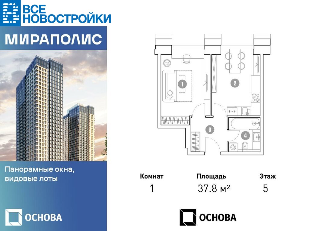 Продаются 1-к апартаменты площадью 37.8 кв.м. на 5-м этаже 36 этажного дома в ЖК "Мираполис" от ГК ОСНОВА.
