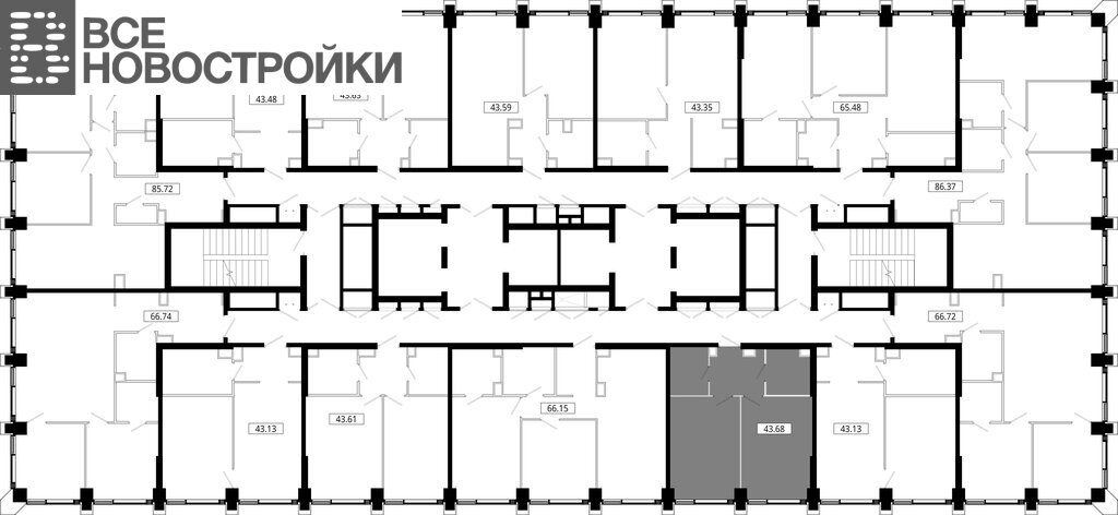 Продается 1-к квартира общей площадью 43.68 кв. м с предчистовой отделкой в ЖК Mod на 17-м этаже 55 этажного дома.