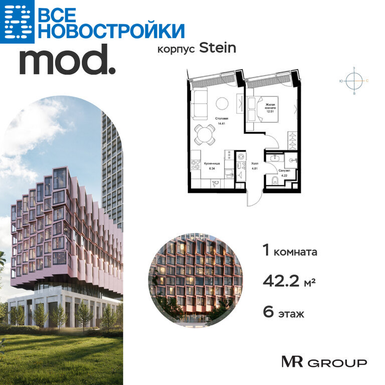 Продается 1-к квартира общей площадью 42.29 кв. м с чистовой отделкой в ЖК Mod на 6-м этаже 9 этажного клубного дома.