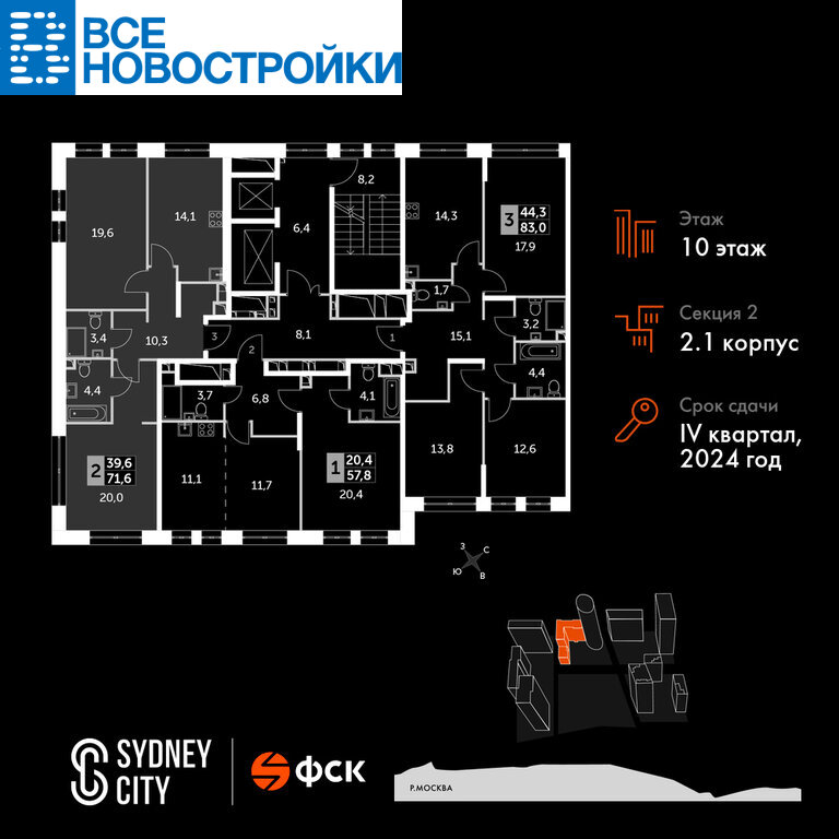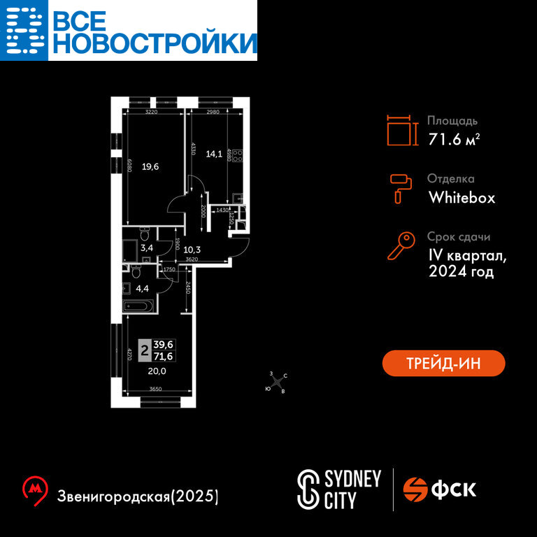 Продаётся 2-к квартира №60 общей площадью 71.6 кв.м. на 10-м этаже 20 этажного дома. Отделка Whitebox.