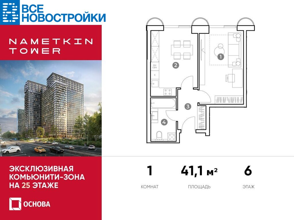 Продаются 1-к апартаменты площадью 41.1 кв.м. на 6-м этаже 29 этажного дома в "NAMETKIN TOWER" от ГК ОСНОВА.
