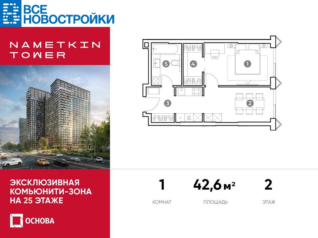 Продаются 1-к апартаменты площадью 42.6 кв.м. на 2-м этаже 29 этажного дома в "NAMETKIN TOWER" от ГК ОСНОВА.