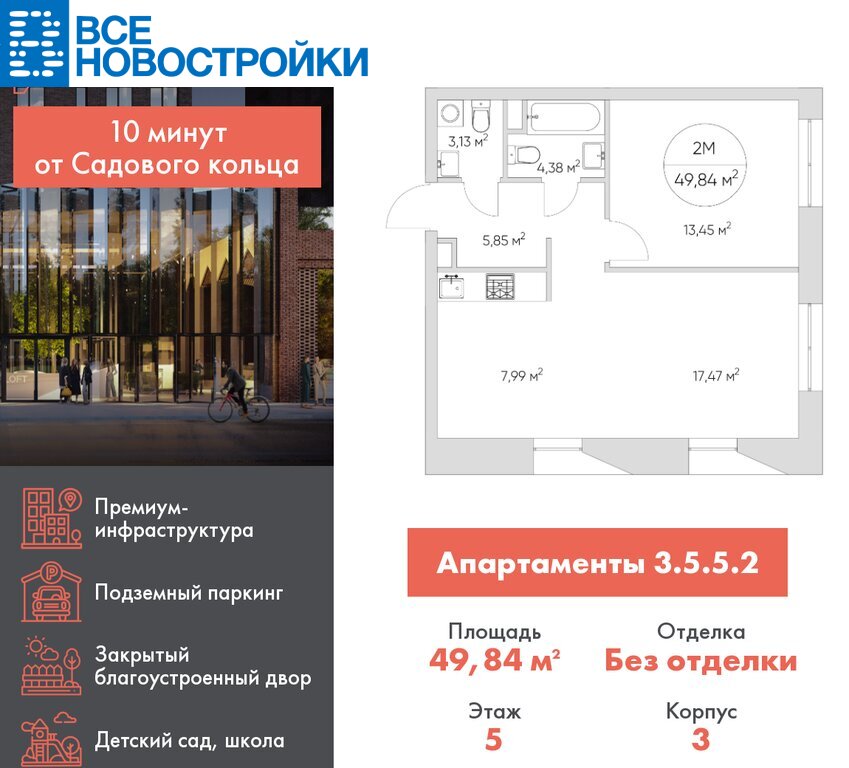 Продаётся 2-комнатные апартаменты площадью 49,84 кв.м на 5 этаже первого в России спортивного апарт-комплекса бизнес-класса N'ICE LOFT, расположенного на границе Таганского и Нижегородского районов Москвы, в нескольких минутах езды от ТТК. Апартаменты в этом спортивном мини-городе располагаются в 7 корпусах, спроектированных в концепции «неолофт». N'ICE LOFT собрал в себе лучшие решения, присущие лофтам — от высоких потолков до 4,9 м и панорамных окон до свободных планировок. Здесь — нестандартная пластичная архитектура: угловое остекление, клинкерный кирпич и алюминиевые панели, сочетания разных материалов, цветов и фактур. Динамичный характер N'ICE LOFT подчеркивает прилегающий к комплексу спортивный парк. Концепция проекта предлагает самый широкий спектр видов физической активности: освещенное поле для мини-футбола , беговая дорожка с системой хронометража и табло, площадка для стритбола и зона воркаута, столы для текбола и зона кардио, панна-футбол, йога-класс на открытом воздухе, зона уличного бокса, а также ледовый комплекс с двумя круглогодичными тренировочными площадками и раздевалками с высококачественным оборудованием, сауной и зонами отдыха. В окружении N'ICE LOFTнаходится сразу несколько парков. Главный из них — Таганский парк – одна из самых старых парковых территорий Москвы. Другое направление приведет вас к Лефортовскому парку, рядом с которым расположена Рогожская слобода.