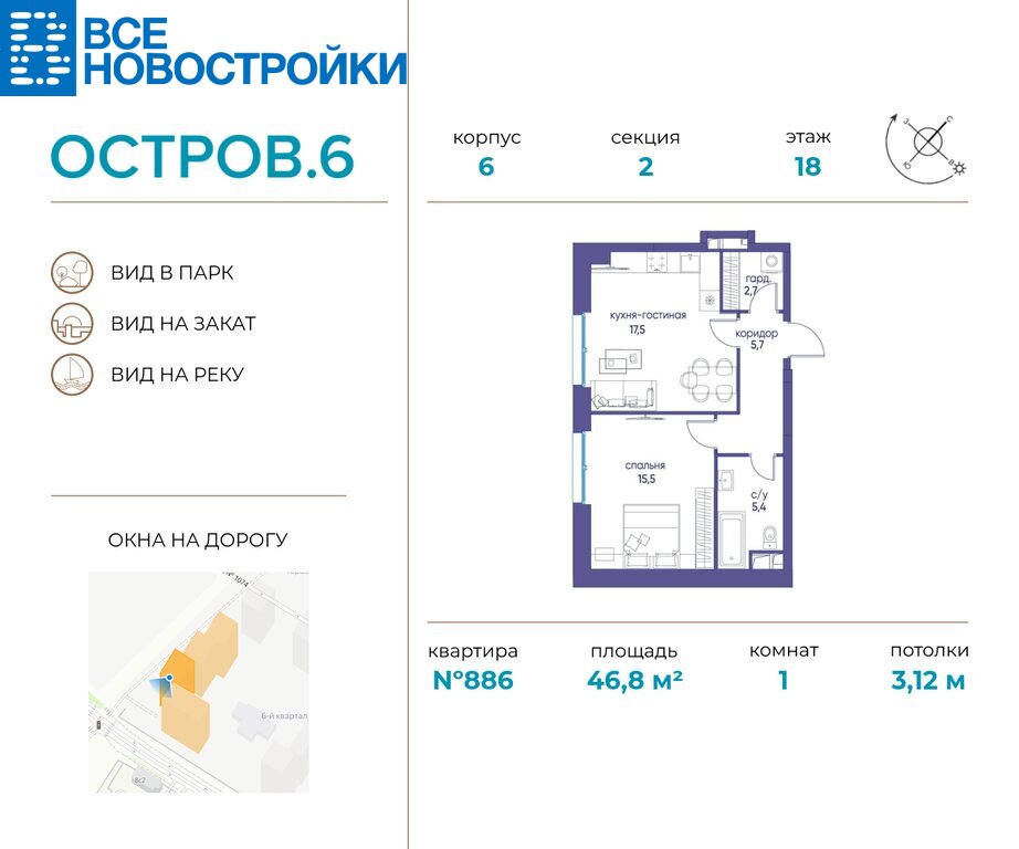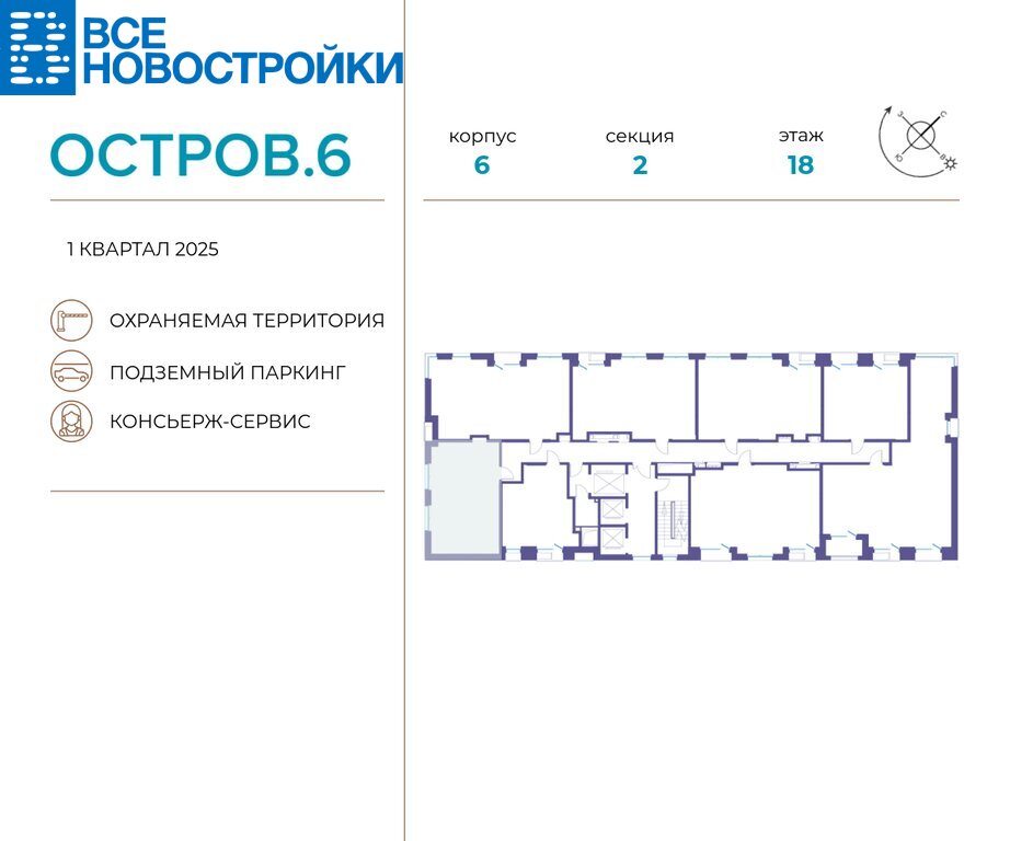 ОСТРОВ – жилой комплекс в окружении реки и природных парков на западе Москвы. В квартале ОСТРОВ.6 шесть корпусов бизнес-класса высотой 16–22 этажа. Он расположен у Центрального парка около станции метро "Терехово". Светлые стильные корпуса имеют узнаваемый вид благодаря уступчатым фасадам с лоджиями, французскими балконами, террасами и угловым остеклением. Настоящая достопримечательность квартала – корпус 5, дом с оригинальным элегантным фасадом, превосходными видовыми характеристиками и пентхаусами на верхних этажах.