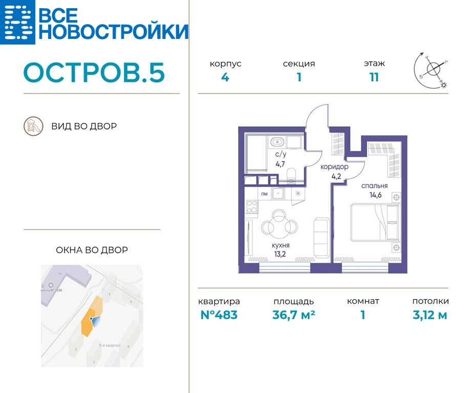 Продается 1-комн. квартира в ЖК «ОСТРОВ» на 11-м этаже. Общая площадь лота составляет 36.72 кв. м, из которых 14.60 кв. м отведено под жилую и 13.20 кв. м под кухонную зону. 1 совмещенный санузел. В жилой зоне 2 больших окна на одну сторону, хорошая инсоляция.