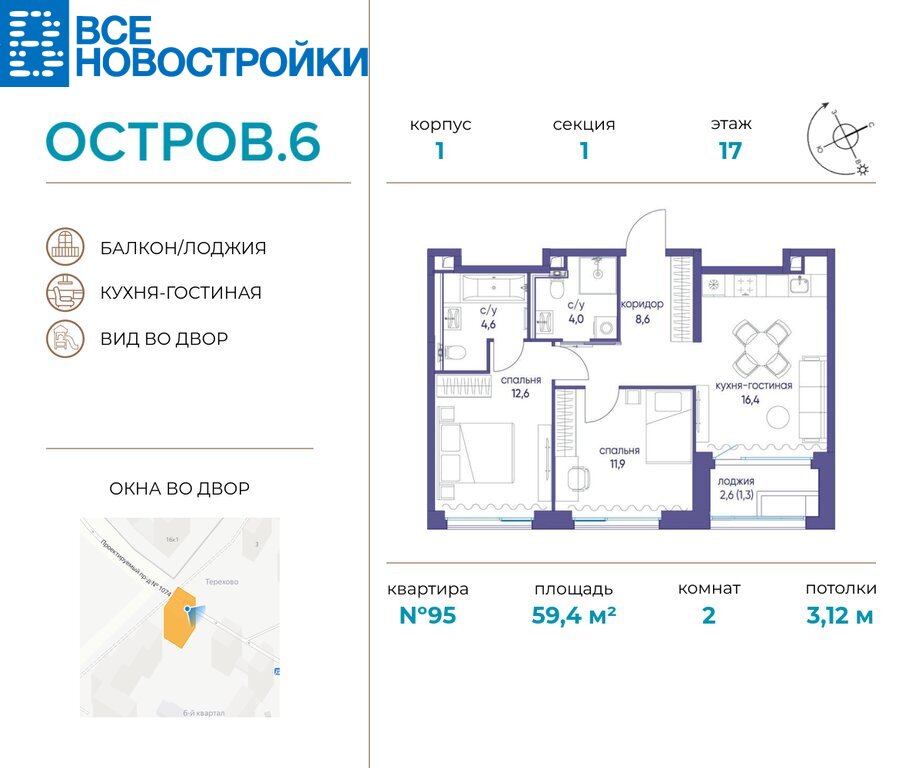 Продается 2-комн. квартира в ЖК «ОСТРОВ» на 17-м этаже. Общая площадь лота составляет 59.42 кв. м, из которых 24.50 кв. м отведено под жилую и 16.40 кв. м под кухонную зону. 2 совмещенных санузла. В жилой зоне 2 больших окна на одну сторону, хорошая инсоляция.