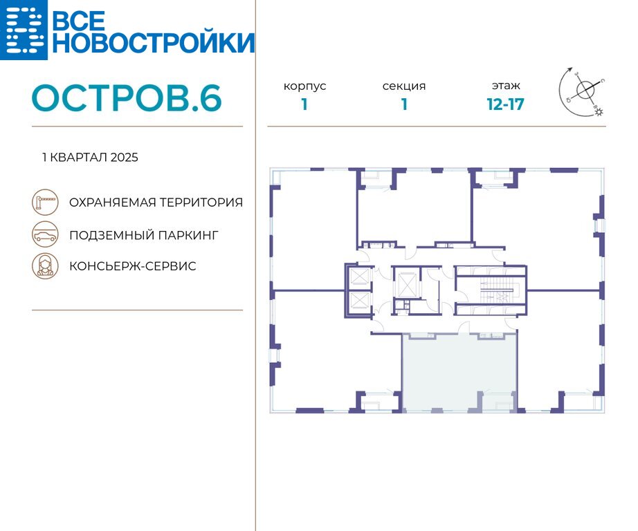 Квартира расположена в квартале 6, в корпусе 1 (секция 1). В каждом подъезде запроектирован пассажирский и грузовой лифты.