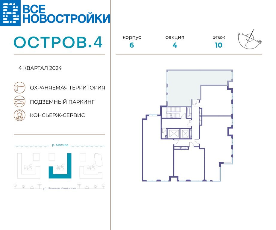 Квартира расположена в квартале 4, в корпусе 6 (секция 4). В каждом подъезде запроектирован пассажирский и грузовой лифты.