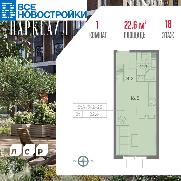 Продаётся квартира-студия общей площадью 22.6 кв. метров на 18 этаже жилого квартала “Парксайд“. Возводится в районе Чертаново Центральное Южного административного округа Москвы. В 2 км от будущего комплекса находится станция метро «Пражская». Для автомобилистов есть удобные выезды на Варшавское шоссе и Чертановскую улицу.