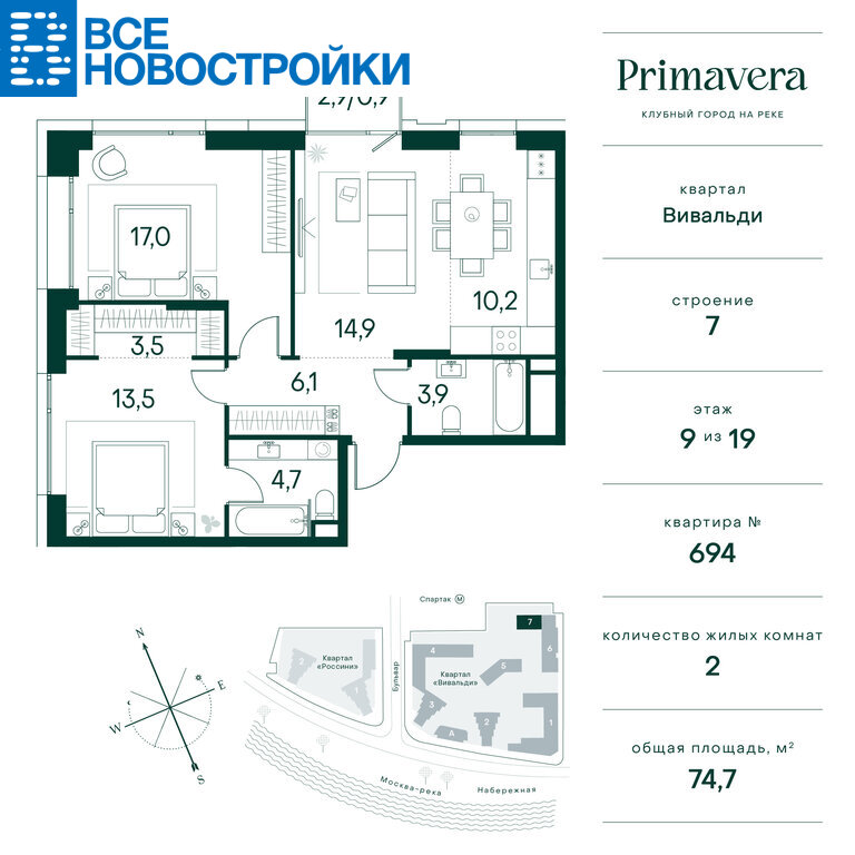 Продаётся 2-комнатная квартира в ЖК «Клубный город на реке Primavera», общей площадью 74.70 кв.м., на 9 этаже.