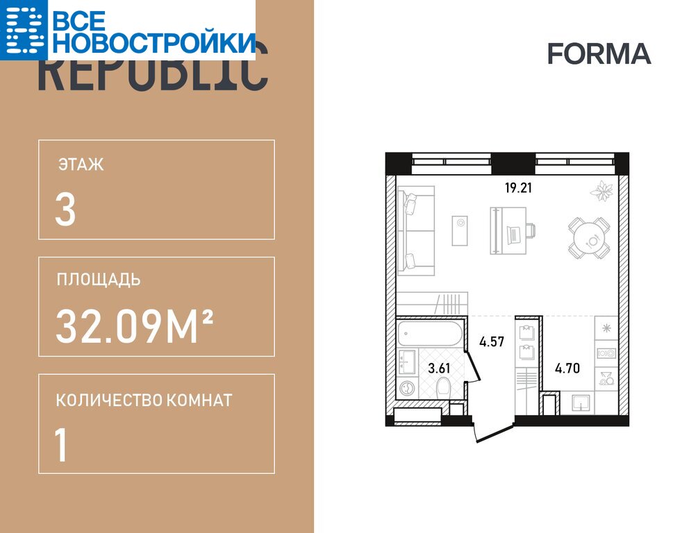 Прямая продажа от застройщика! Продается 1-к. квартира общей площадью 32.09 кв.м. на 3-м этаже 27 этажного дома, корпус Корпус 4.1. С отделкой White Box. В жилом квартале премиум-класса Republic от девелопера FORMA. Всего в 7 минутах пешком от станции метро Белорусская.