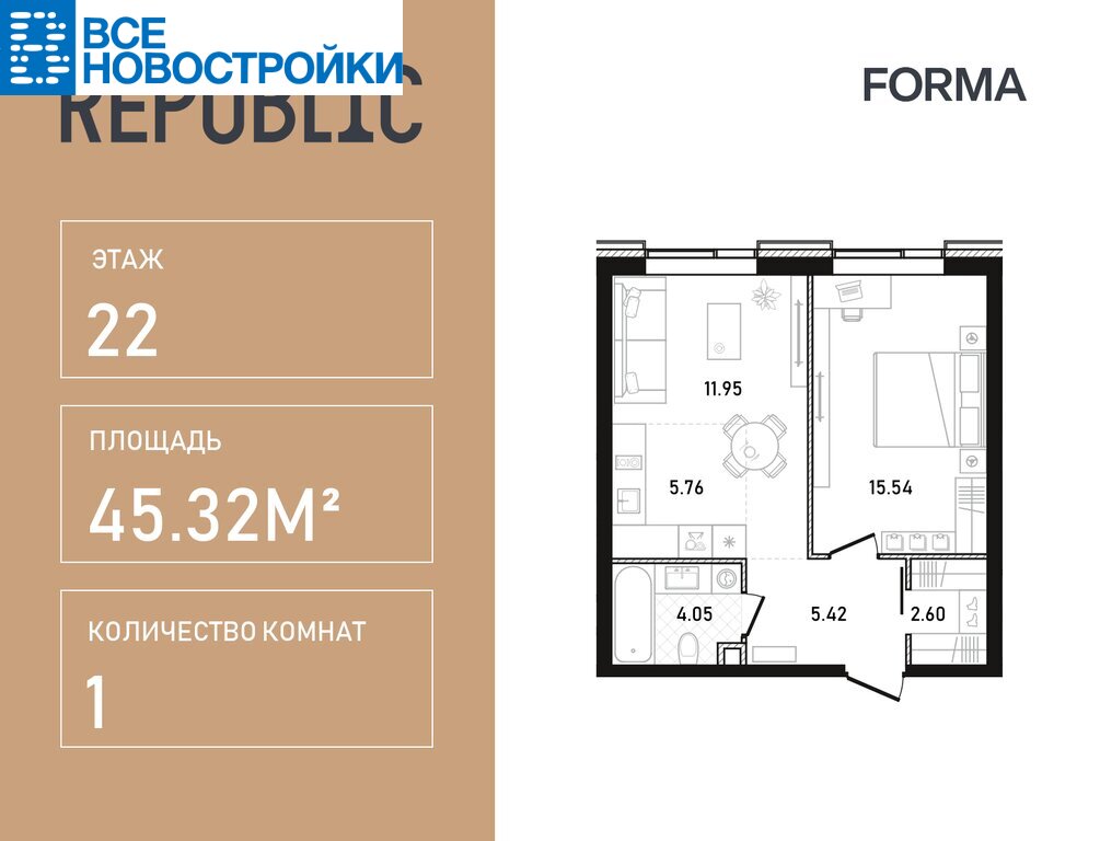 Прямая продажа от застройщика! Продается 1-к. квартира общей площадью 45.32 кв.м. на 22-м этаже 33 этажного дома, корпус Корпус 4.2. Без отделки. В жилом квартале премиум-класса Republic от девелопера FORMA. Всего в 7 минутах пешком от станции метро Белорусская.