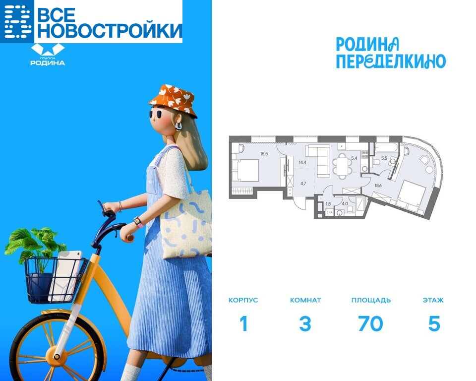 Продаётся 3-комнатная квартира площадью 70 м² на 5 этаже в Жилом Комплексе "Родина Переделкино".