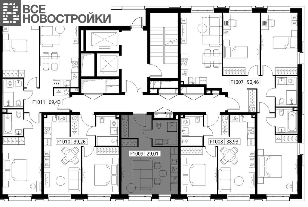 • Широкий выбор квартир — от компактных студий до просторных квартир с тремя спальнями и пентхаусов