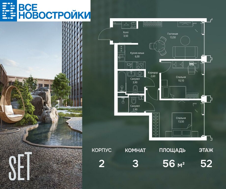 3-комнатная квартира площадью 56.00 кв.м, расположенная в корпусе 2, на 52 этаже 59 этажного дома.
