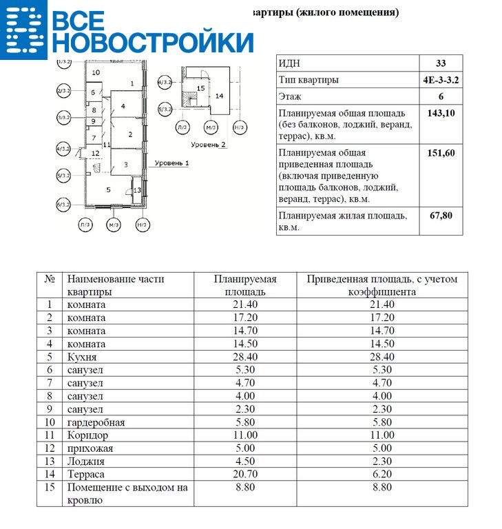 - Площадь квартиры 143.1 кв.м.+ терраса 20.7 кв.м. (терраса на крыше). Итого 163.8 кв.м.