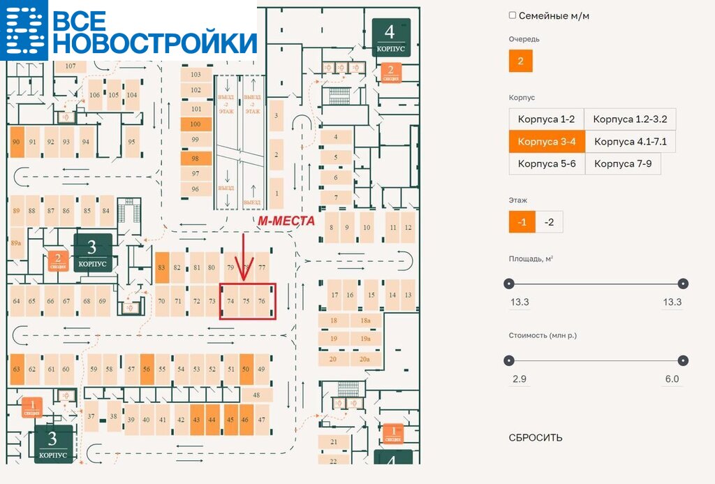Также продается 3 смежных м/места в паркинге по себестоимости (номера 74-75-76). Цена трех м/м - 8.5 млн. Для справки у застройщика сейчас цены 3.1-3.2 млн. на аналогичные месте.