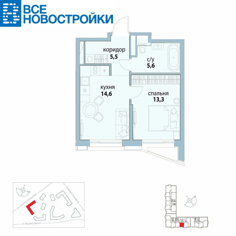 Квартира расположена в квартале Вдохновение, в корпусе 33 (секция 2). В каждом подъезде запроектировано 5 квартир на этаж, есть пассажирский и грузовой лифты.