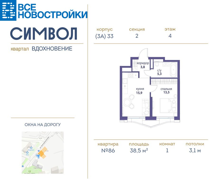 Продается 1-комн. квартира в ЖК «Символ» на 4-м этаже. Общая площадь лота составляет 38.50 кв. м, из которых 13.50 кв. м отведено под гостиную и 15.90 кв. м отведено под кухонную зону. 1 совмещенный санузел.