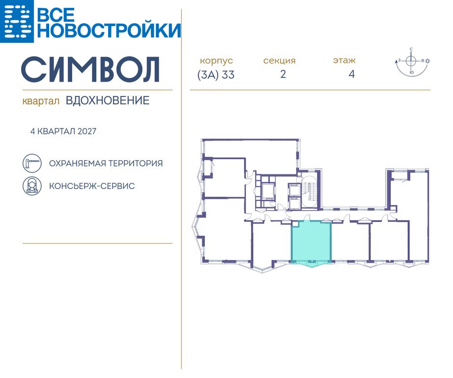 Квартира расположена в квартале Вдохновение, в корпусе 33 (секция 2). В каждом подъезде запроектировано 5 квартир на этаж, есть пассажирский и грузовой лифты.