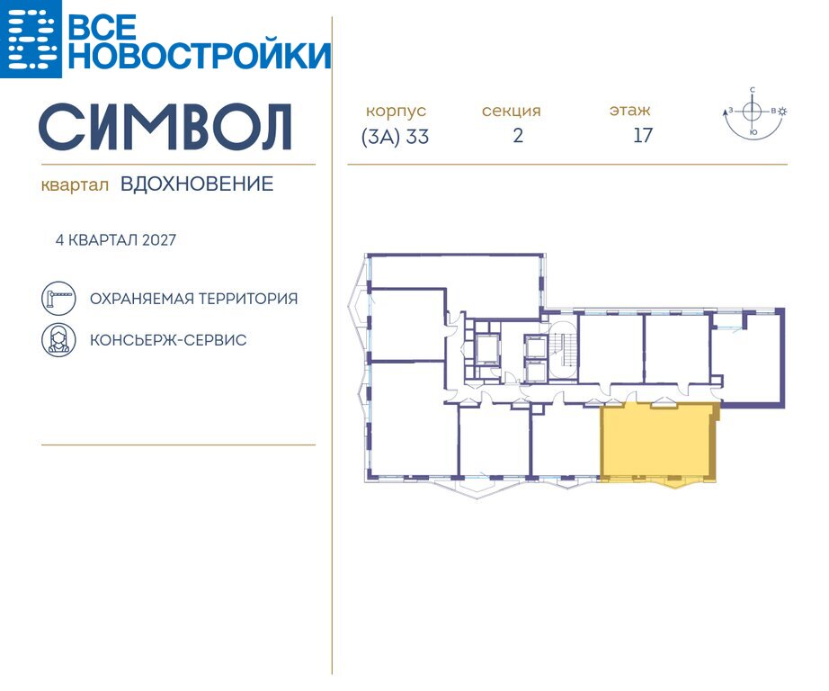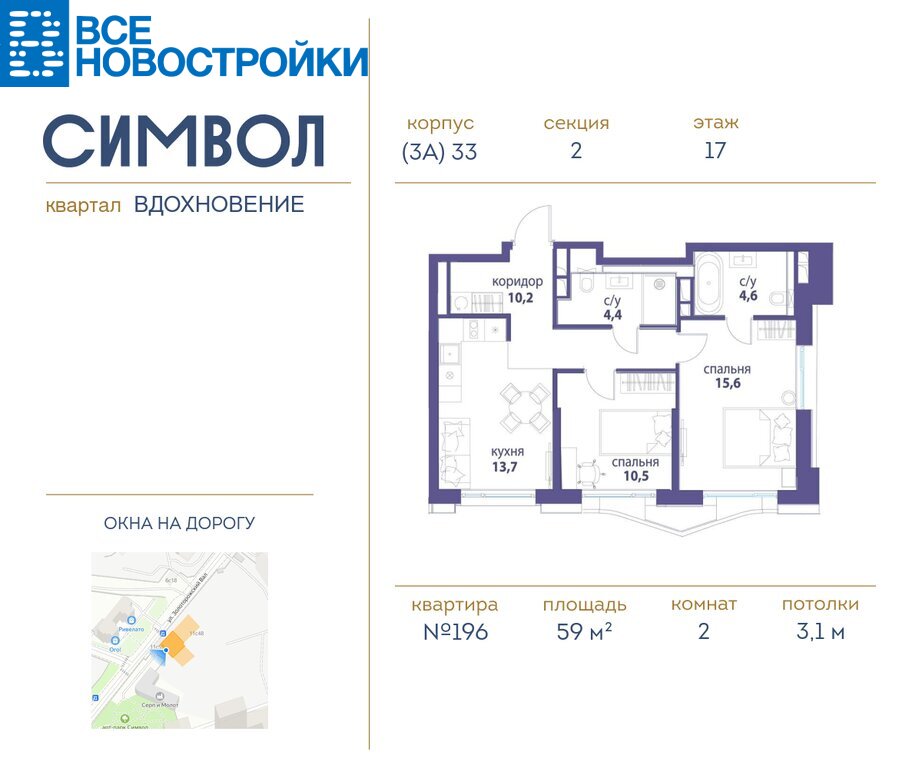 Продается 2-комнатная квартира от застройщика: общая площадь 59.00 м², жилая 26.10 м², кухня 13.70 м², 17-й этаж, жилой квартал «Вдохновение», корпус 33 (секция 2). Срок сдачи: 4 квартал 2027 года.